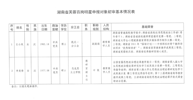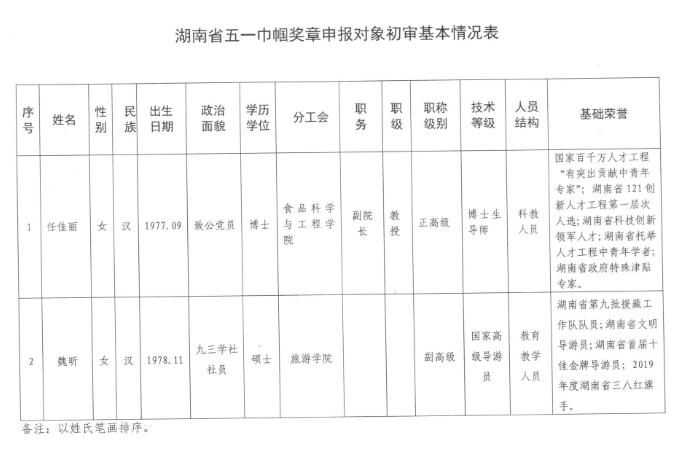 附:湖南省五一巾帼奖章申报对象初审基本情况表、湖南省芙蓉百岗明星申报对象基本情况表。